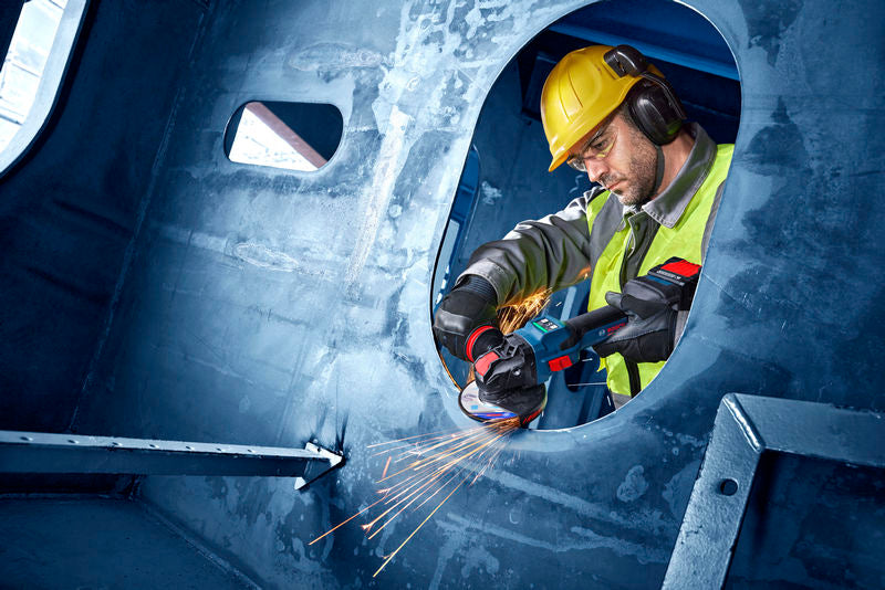 Akku-Winkelschleifer mit X-LOCK EXWX18V-15S, Der kabellose Winkelschleifer EXPERT EXWX18V-15S 18V liefert hervorragende Leistung mit einer äquivalenten kabelgebundenen Leistung von 1500 W. Dieses Werkzeug besitzt einen BITURBO BRUSHLESS-Motor, der für die extreme Leistung der EXPERT-Akkus ausgelegt ist. Es ermöglicht den schnellen und bequemen Zubehörwechsel mit dem werkzeuglosen X-LOCK-Klicksystem. Dieser Winkelschleifer bietet ausgezeichneten Anwenderschutz mit Intelligent Brake, Kickback Control, Drop Control und Restart Protection. Und du profitierst von einer hervorragenden Kontrolle über das Werkzeug dank seines ergonomischen Designs und der HMI für die vorbeugende Werkzeugwartung. Dieser EXPERT-Winkelschleifer ist unverzichtbar bei Arbeiten an Öltanks, Windrädern, Türmen und Brücken. Und er ist auch für lange Werkstücke geeignet. Das reicht von Bewehrungsstäben mit einem Durchmesser von mehr als 20 mm bis hin zu Beton. Kompatibel mit dem Bosch Professional 18V-System und mit der markenübergreifenden AMPShare Akku-Allianz. Verwende EXPERT Akkus, um maximale Leistung zu erhalten.